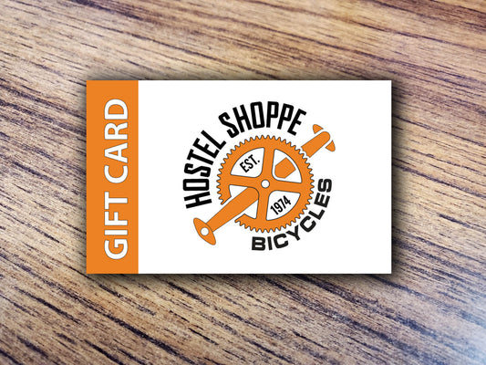 Image of Hostel Shoppe e-gift card against a wooden background.