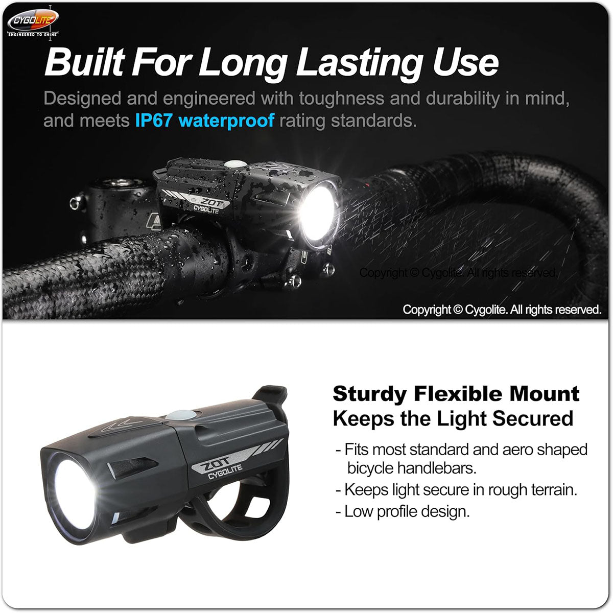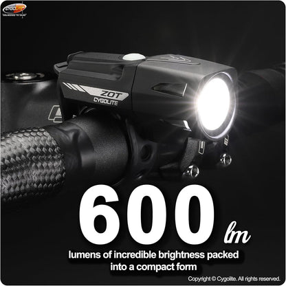 • Take on any road with the aggressively powerful and sleek Zot™ 600. Its impressive 600 lumens fires up extra wide, long range coverage at night, while its lightning-like flashes make you stand out in broad daylight, to ensure safer cycling at all times. Every bit the road cyclist's light, it uses a low profile flexible mount designed to strap quickly and easily to most handlebars including aerobars. Get the most out of your ride with the Zot's uncompromising safety and illumination.