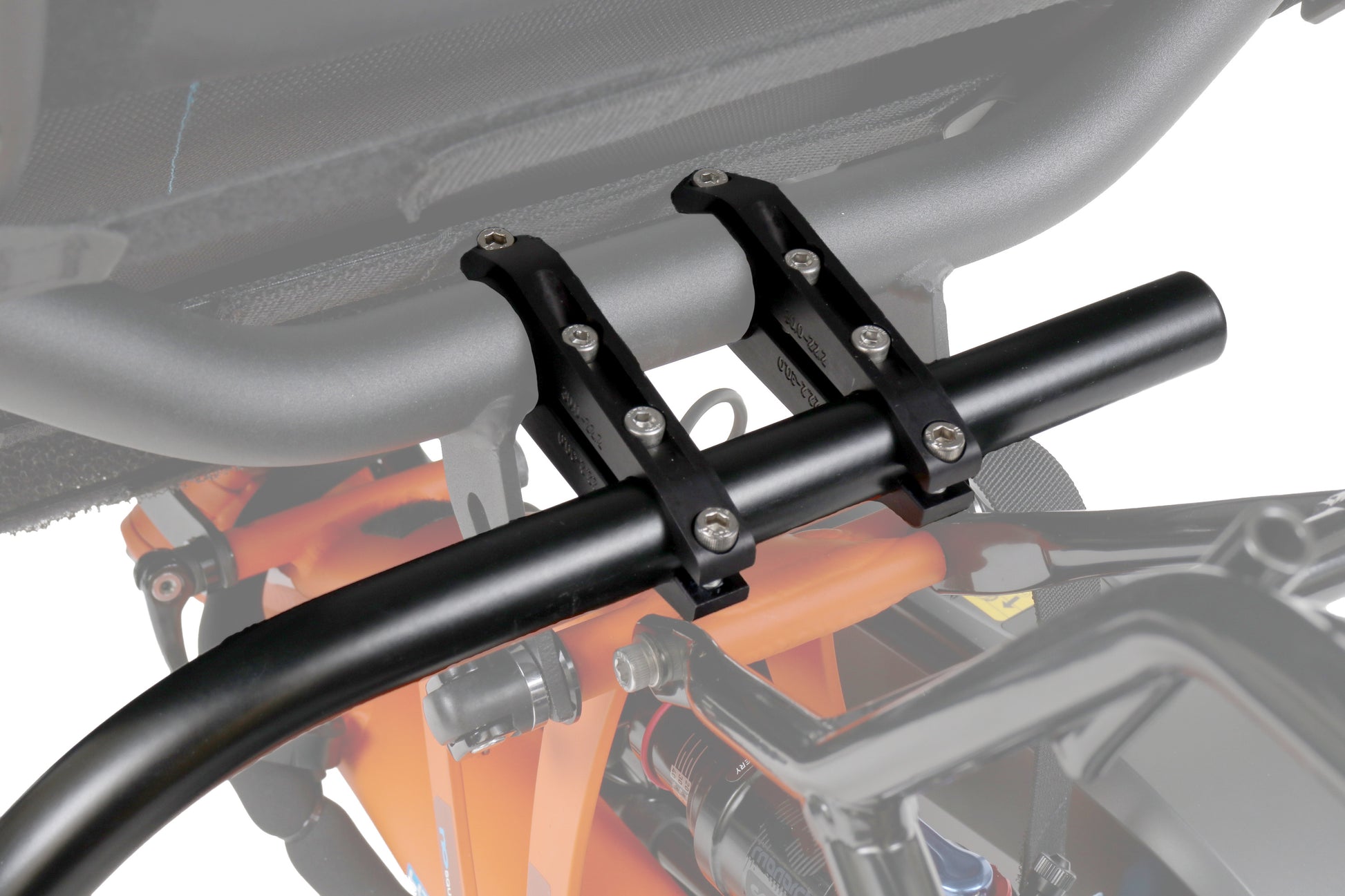 This mount attaches to the back of any Standard Classic ErgoMesh seat (not the Premium ErgoMesh seat). The mount curves out and down to stay clear of the seat adjustment clamp and the rear rack, then it comes forward to your side. The seatside arm can be attached on either side, or (optionally) both if you wish.