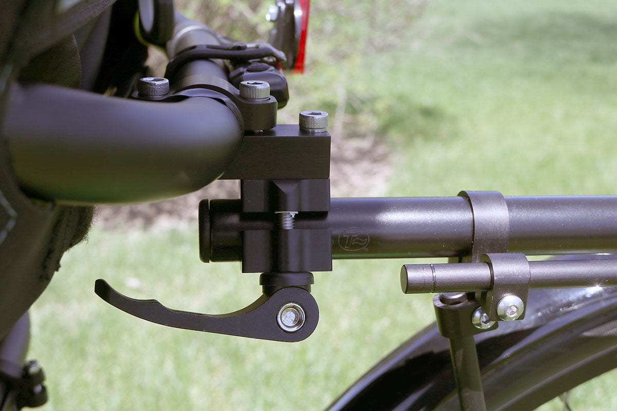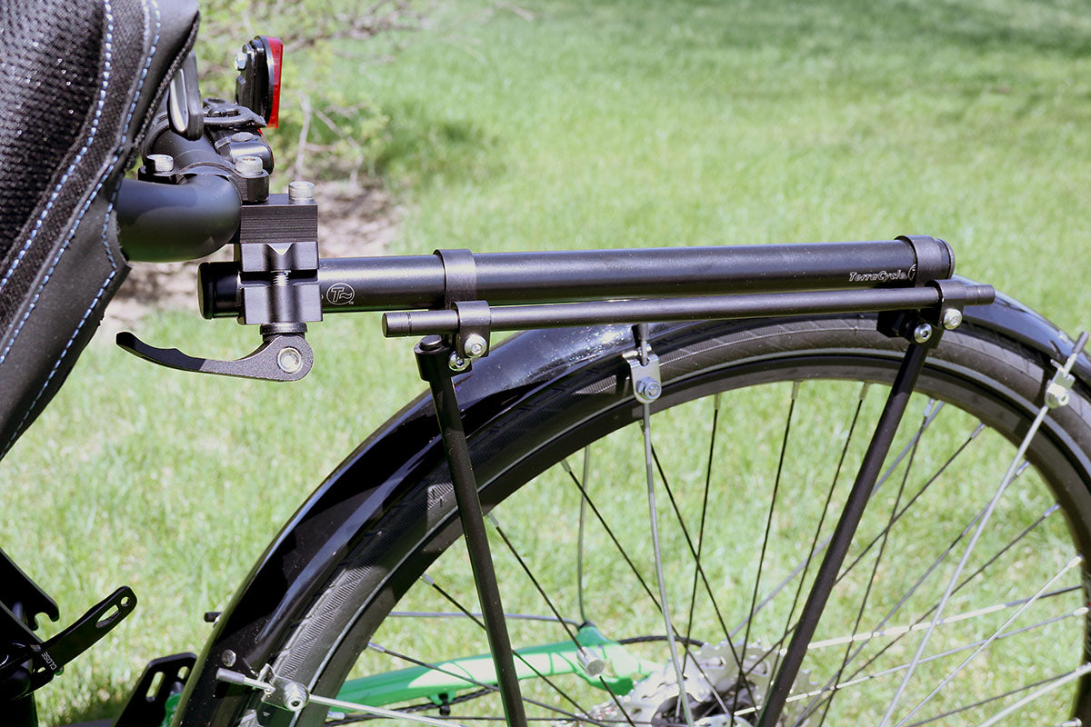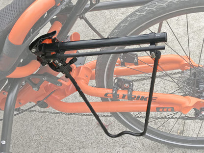 This rack clamps onto a horizontal tube on the back of a trike seat, keeping the cargo weight of your panniers low and central, forward of the suspension element on suspension trikes. This preserves the go-cart-like handling that we all love about trikes. Conventional racks are designed for conventional bikes and can hamper the handling of a trike, creating a wobbling sensation of the rear end. It's high time that someone engineered a rack to suit the low center of gravity that makes trikes so fun to ride.